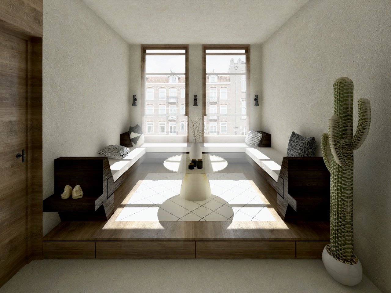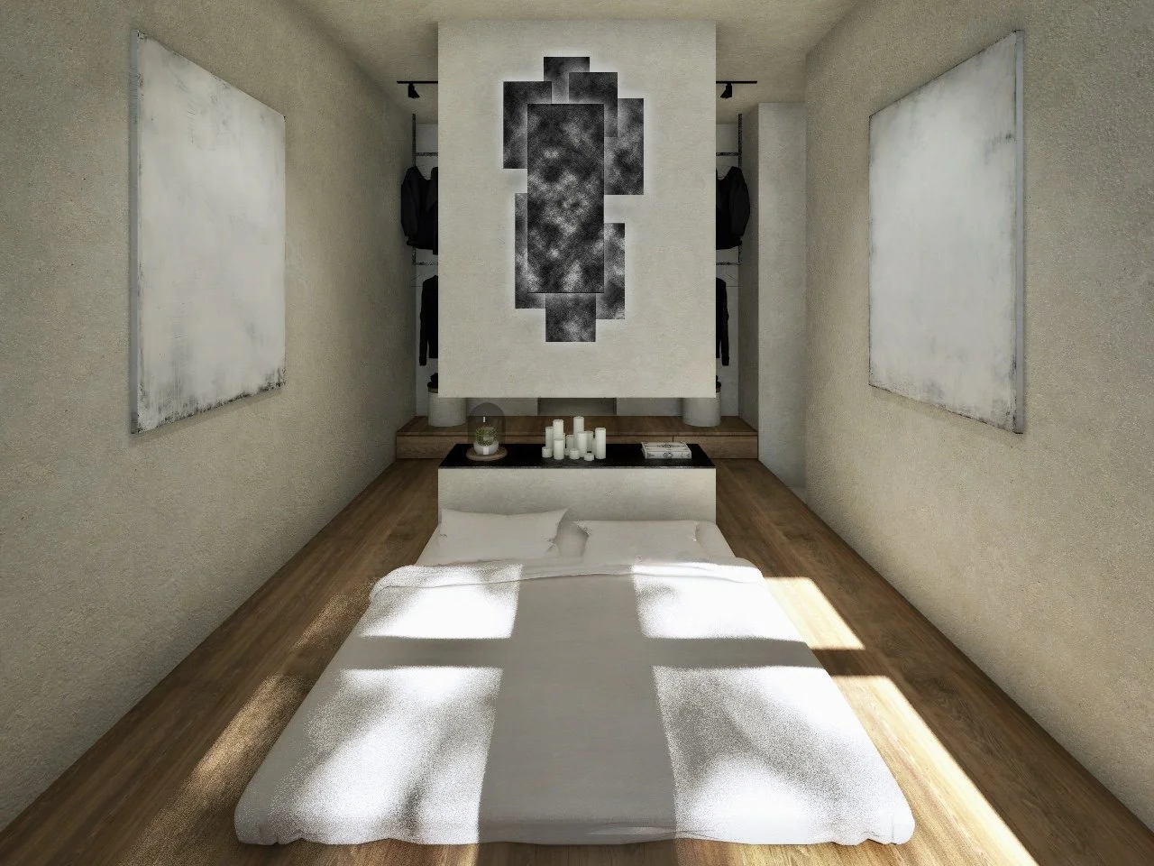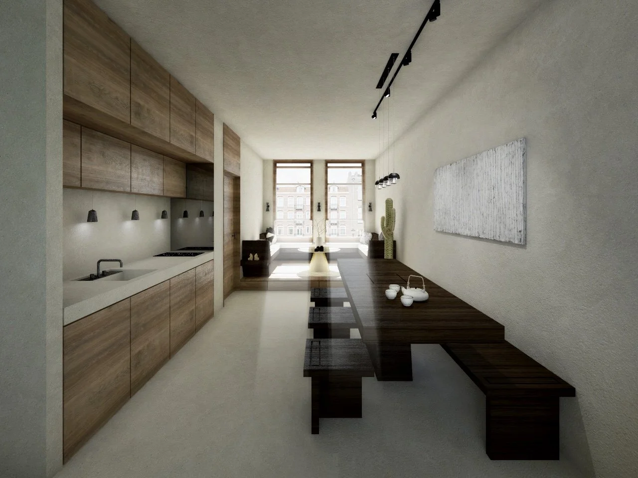 Ce projet de rénovation incarne une esthétique minimaliste inspirée du wabi-sabi, pensée pour un amateur d’art. Le salon, sur une estrade bordée de banquettes, devient un observatoire intime sur la rue. La cuisine intégrée et les rangements discrets assurent l’harmonie visuelle. Côté cœur d’îlot, un bureau et un coin lecture offrent calme et verdure. La chambre, avec son lit futon, prolonge cette quête de sérénité. Le mobilier sur mesure valorise les pièces du propriétaire, notamment via un dressing-vitrine. Des enduits beiges unifient l’espace, qui évoque un monastère moderne, propice à la contemplation et à un art de vivre essentiel.