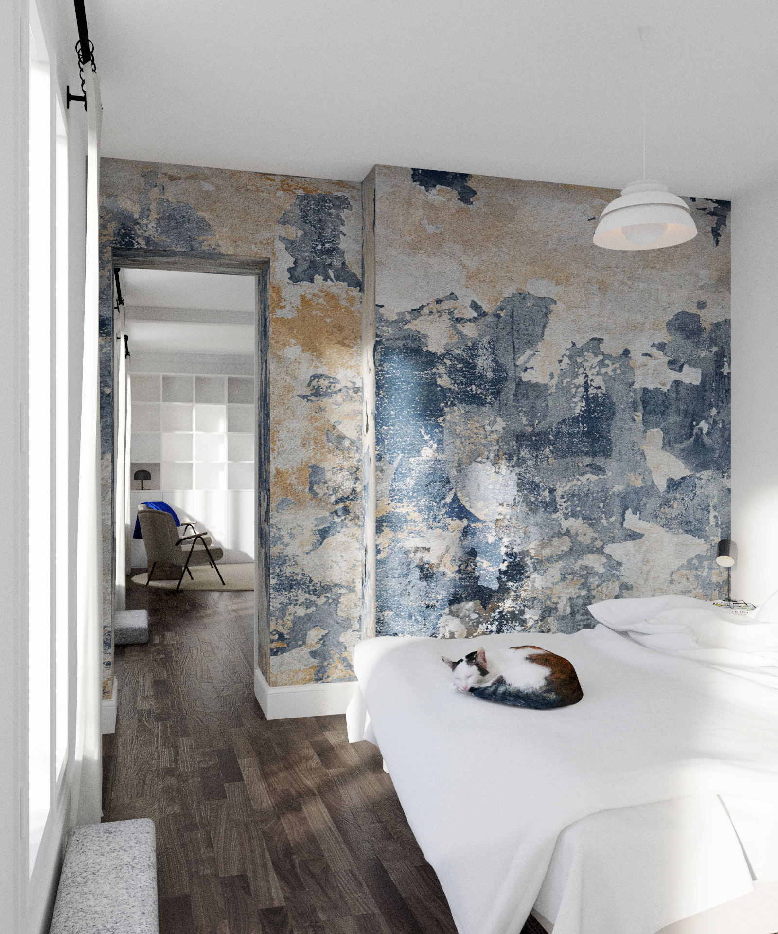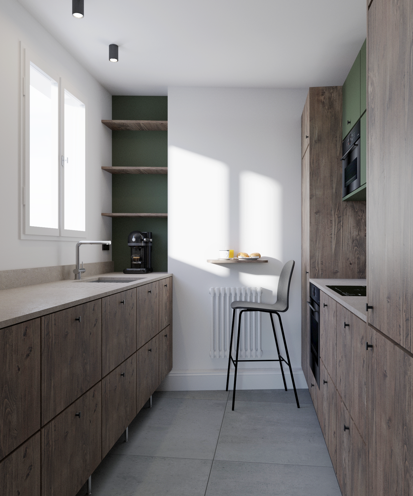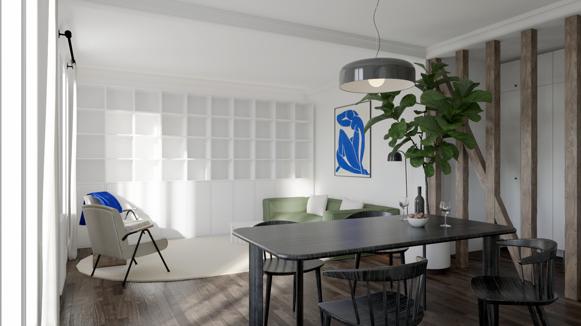 Cet appartement baigné de lumière a été entièrement réorganisé pour révéler son potentiel tout en répondant aux usages contemporains. Dès l’entrée, une cloison mise à nu dévoile une structure à pan de bois, affirmant le caractère historique des lieux. Le séjour, décloisonné, gagne en générosité et luminosité, tandis que les moulures d’origine renforcent son charme. Un mur porteur, orné d’un enduit artisanal, devient une pièce maîtresse. Le projet valorise l’existant avec sensibilité, et une palette naturelle ponctuée de verts et de bleus établit un dialogue subtil entre intérieur et paysage du canal.