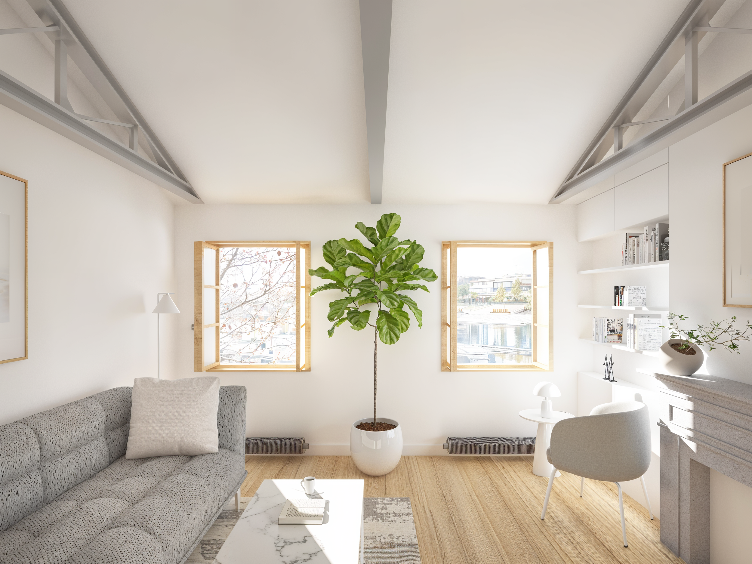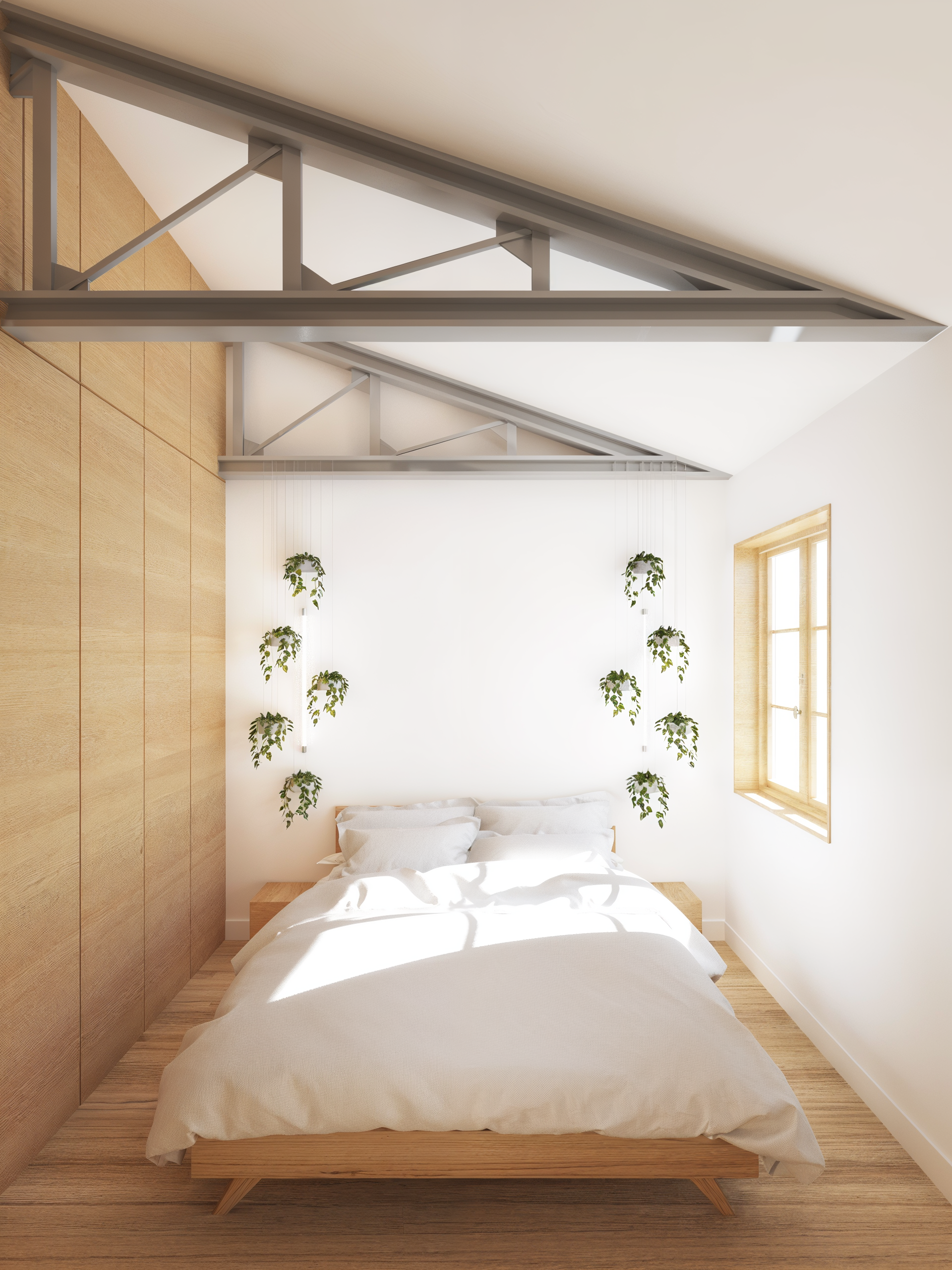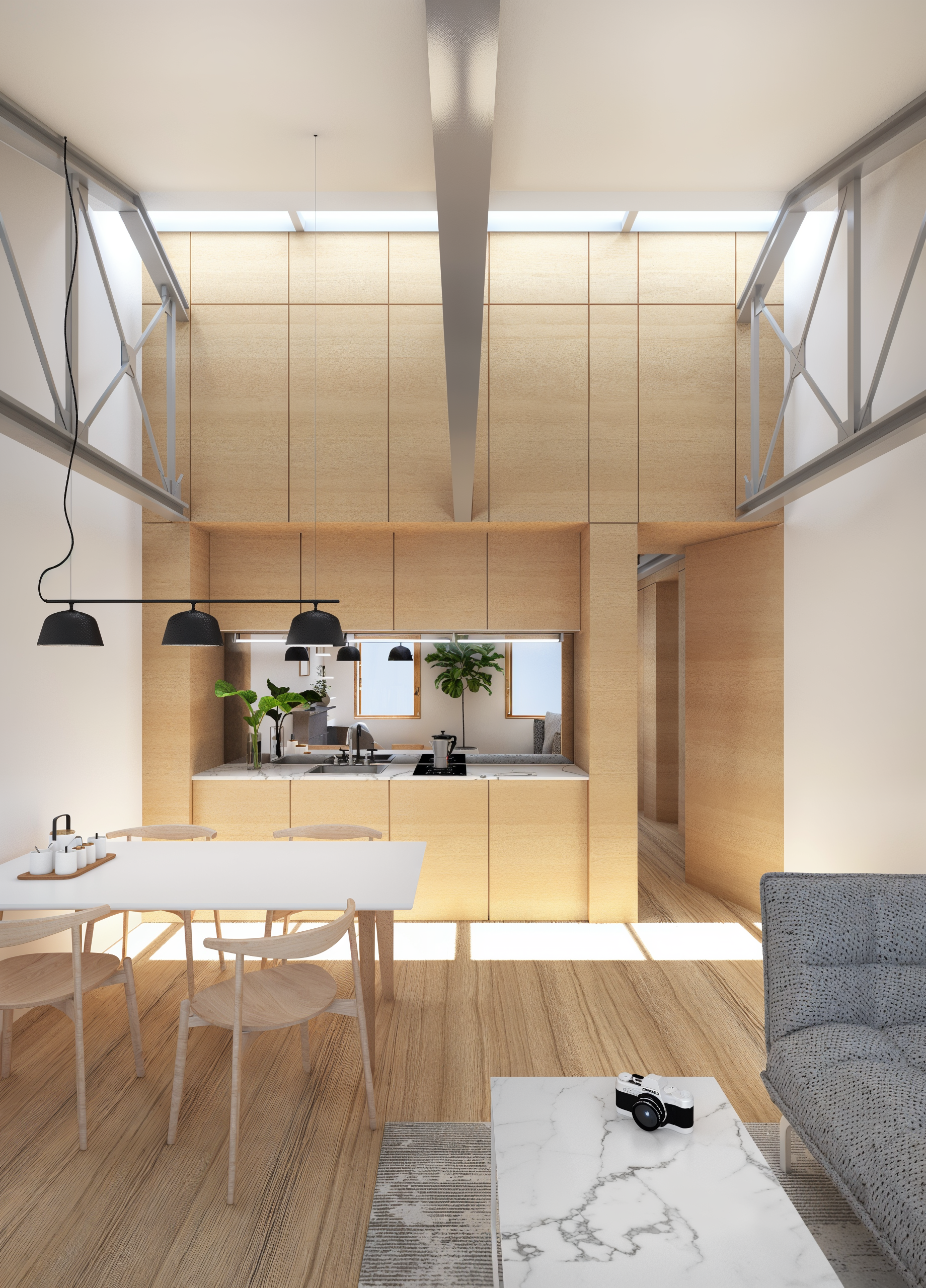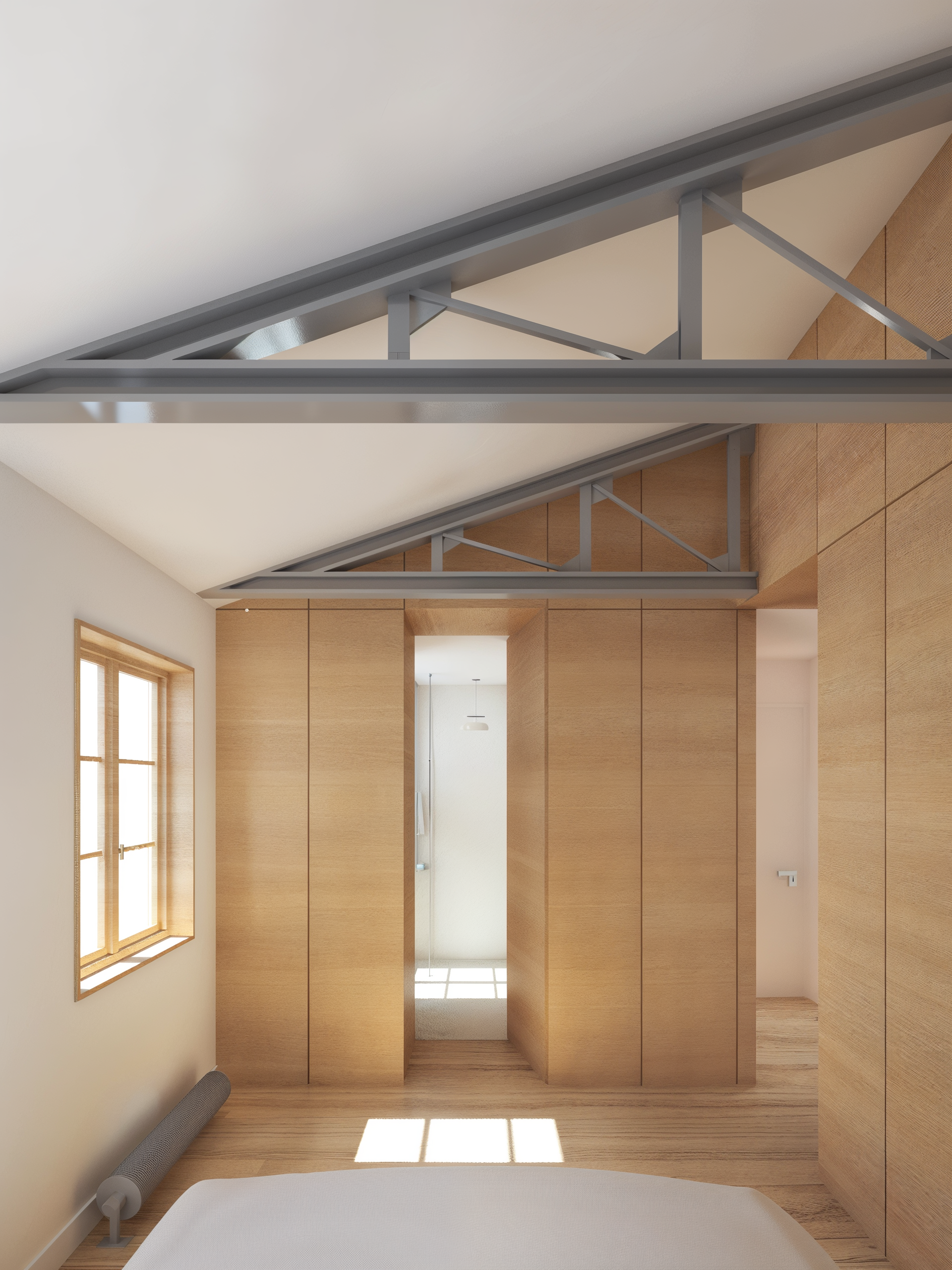 Ce projet rénove un appartement traversant en exploitant son fort potentiel. La récupération des combles révèle la charpente existante, augmentant la hauteur sous plafond et l’impression d’espace. Des menuiseries sur mesure séparent discrètement les zones jour et nuit, tout en intégrant cuisine et rangements optimisés. L’esthétique adopte un minimalisme chaleureux, dominé par le chêne. La charpente en acier dialogue avec des éléments au design industriel : luminaires, robinetterie, radiateurs. Une palette restreinte de matériaux et de teintes crée une ambiance apaisante et intemporelle, à l’équilibre entre fonctionnalité et expression architecturale.